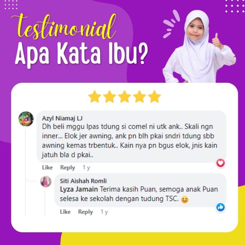 "Tudung sekolah anak mula 5 tahun sampai sekarang dah 9 tahun semua beli dari TudungSiComel. Mak dah tak stress pagi2 nak siapkan anak sebab anak boleh pakai sendiri. Jimat masa dan Mudah..."