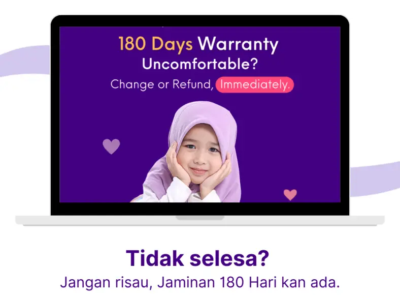 Apa sahaja yang anda rasa tak berbaloi, tak selesa, tak suka dan sebagainya, ianya termasuk dalam Jaminan 180 hari kita.